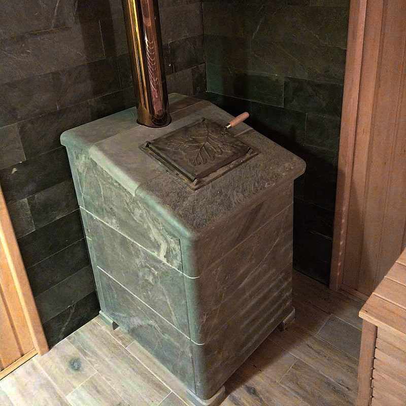 - Облицовка из натурального камня не только украшает печь, но и дополнительно аккумулирует тепло, излучая мягкое лучистое тепло, безопасное для кожи.