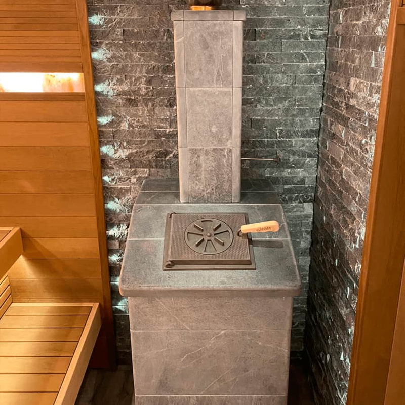 Печь ТЕХНОЛИТ Гром в каменной облицовке — это сочетание инноваций, надежности и эстетики для истинных ценителей комфорта, тепла и традиций русской бани.