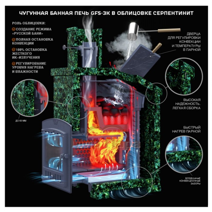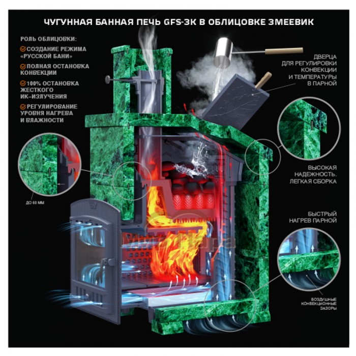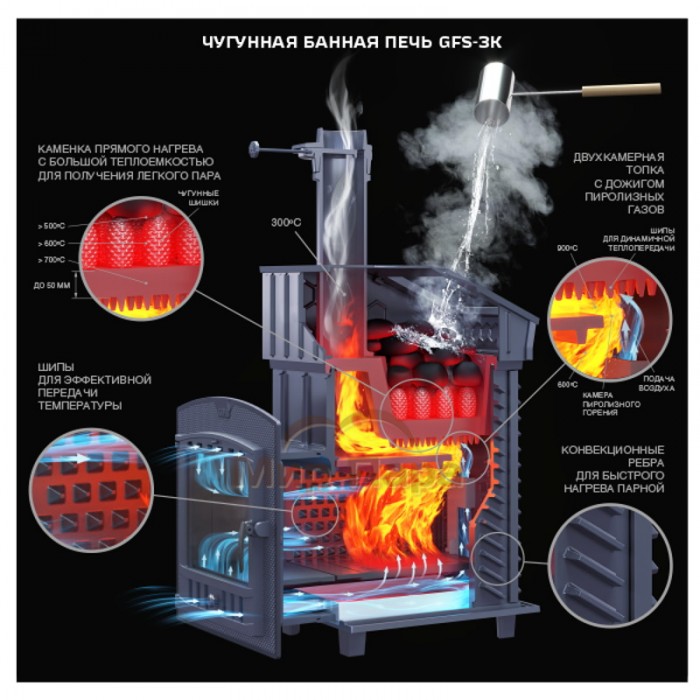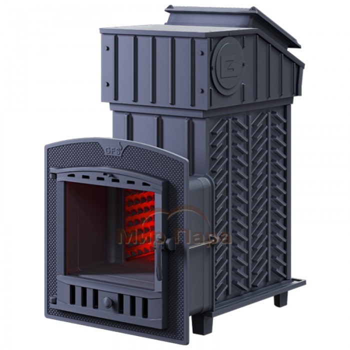 Гефест GFS ЗК 18 (П2) - печь с усиленной каменкой большей массы, с единым углублением внутрь топки для дополнительной укладки чугунного заряда. Теплосъемные шипы, со стороны горения пламени, в разы увеличивают площадь соприкосновения огня с каменкой и ускоряют передачу тепла, а также способствуют лучшему дожигу смешивая потоки пламени и воздуха поступаемого из воздушника. Эти усовершенствования значительно повышают мощность парообразования печи и выдают большее количество пара при непрерывной подаче воды. Каменка печей GFS-ЗК является незаливаемой.