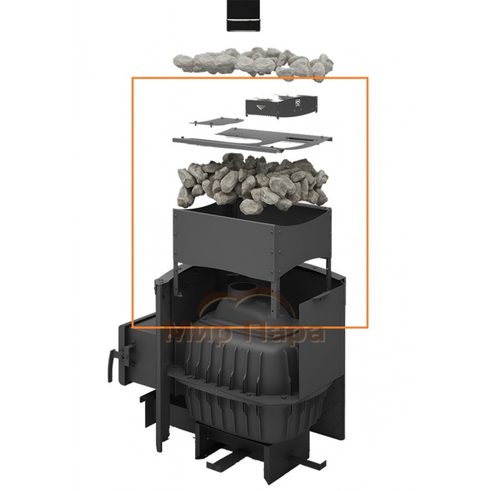 Закрытая каменка позволяет камням прогреться до более высоких температур для получения с них легкого пара. Распределители и дозаторы в конструкции обеспечивают равномерное по площади и по времени распределение воды по камням каменки для получения максимального количества пара.