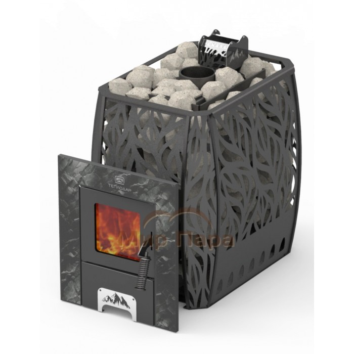 Стильная банная печь с премиальным дизайном: контрастная облицовка под камень, характерный для горной местности и ажурный кожух, в котором угадываются очертания растительных элементов, создают эффектный акцент в вашей бане. Эта банная печь создана для стабильной и комфортной парной: быстро выходит на рабочий режим, дает ровный прогрев камней и обеспечивает качественный мелкодисперсный пар.