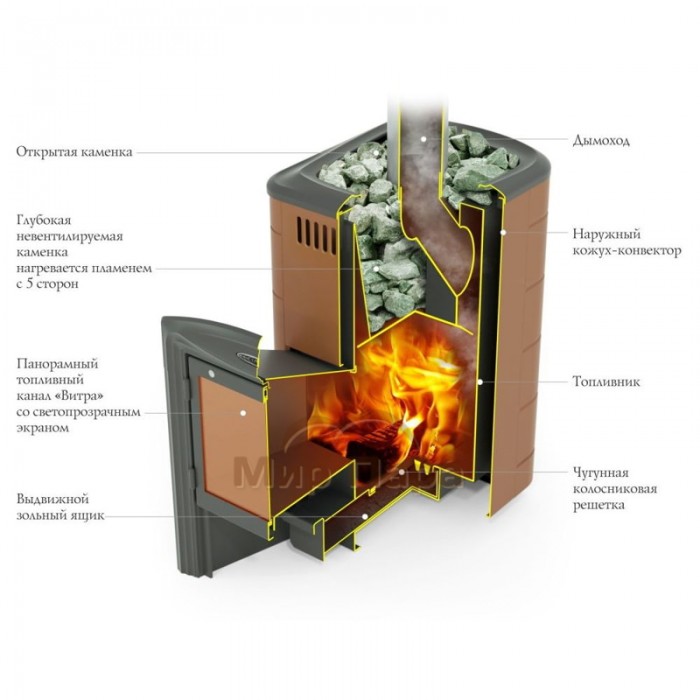 - Нагреваемая с пяти сторон невентилируемая каменка - хороший прогрев камней.