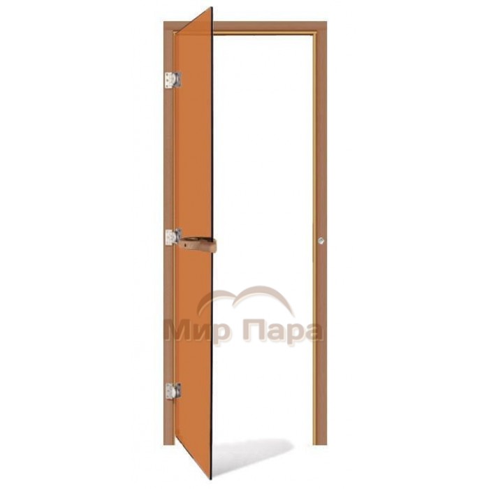 Данная модель двери подойдёт для установки в дверном проёме стандартных размеров. Стекло тонировано в благородный бронзовый оттенок. В комплект входит трёхсторонний короб и массивная удобная ручка из канадского кедра. Дверное полотно крепится на три хромированные петли. Петли находятся с левой стороны, что следует учитывать в планировке. Благодаря уплотнителю и магнитному фиксатору дверь надёжно закрывается и не пропускает потоков воздуха между помещениями.