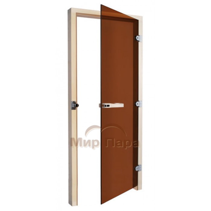 Данная модель двери подойдёт для установки в дверном проёме стандартных размеров. Стекло тонировано в благородный бронзовый оттенок. В комплект входит трёхсторонний короб и массивная удобная ручка из осины. Дверное полотно крепится на три хромированные петли. Петли находятся с правой стороны, что следует учитывать в планировке. Благодаря уплотнителю и магнитному фиксатору дверь надёжно закрывается и не пропускает потоков воздуха между помещениями.