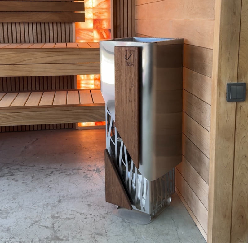 Дизайн каменки BORN AIR. Изящный орнамент на корпусе гармонично сочетается с элементами из термоясеня. Вертикальная конструкция печи с улучшенными аэродинамическими свойствами позволяет прогонять большую массу воздуха. Благодаря активной циркуляции, искусственно-создаваемой самой каменкой, парная за считанные минуты наполняется теплом.