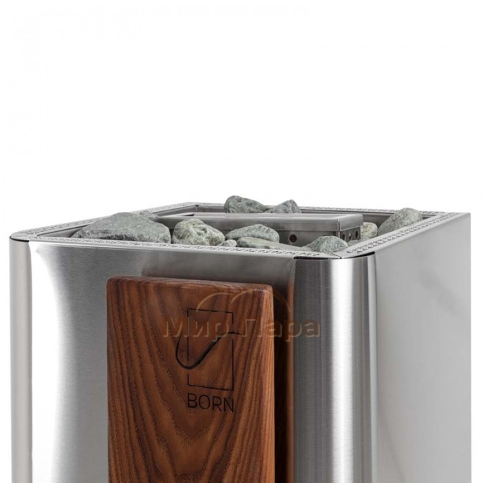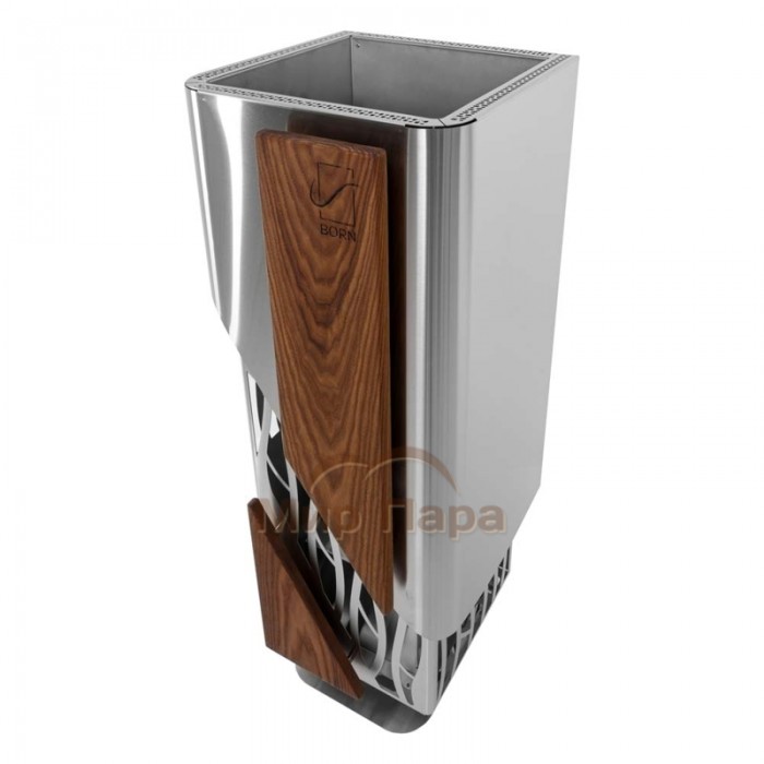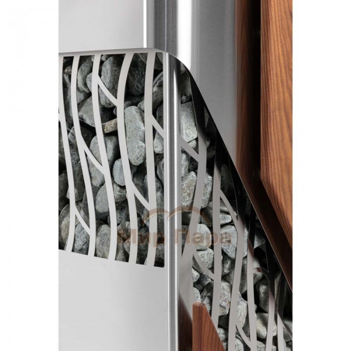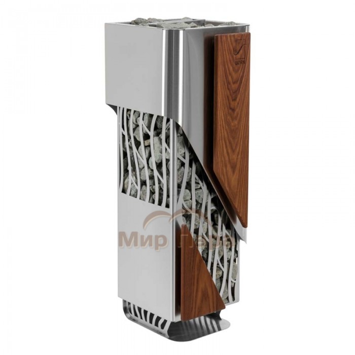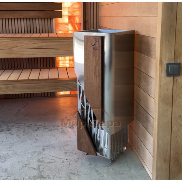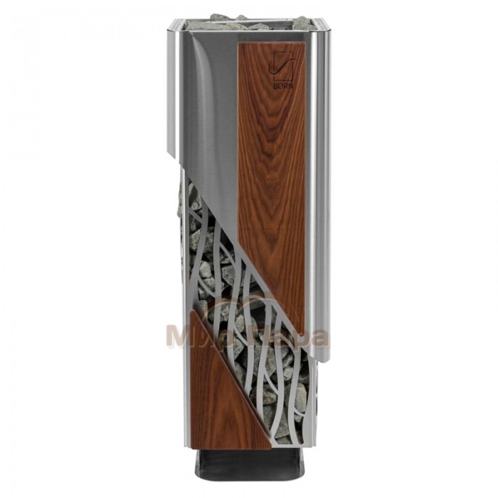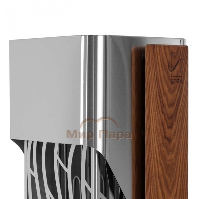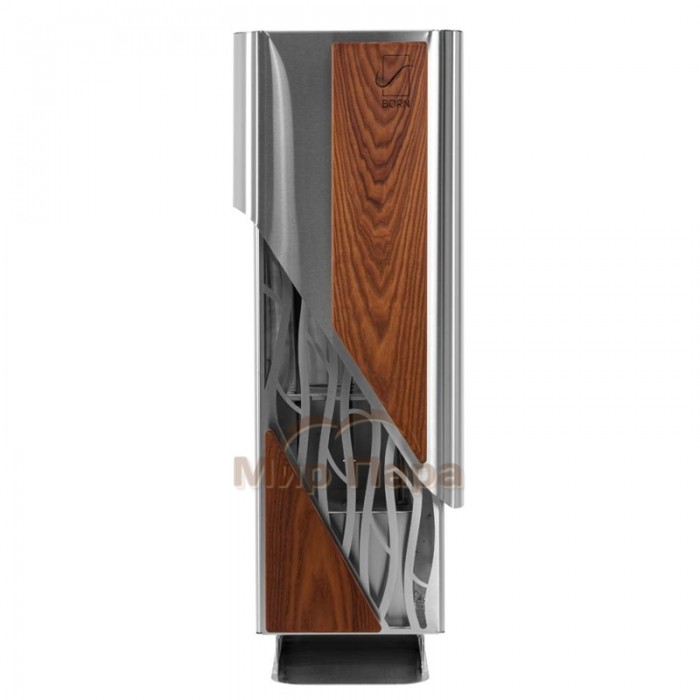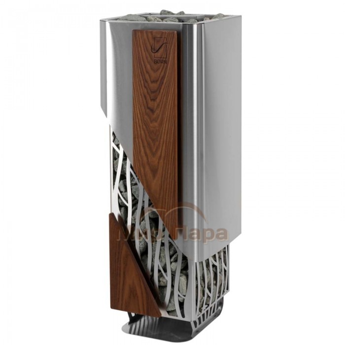 Дизайн каменки BORN AIR. Изящный орнамент на корпусе гармонично сочетается с элементами из термоясеня. Вертикальная конструкция печи с улучшенными аэродинамическими свойствами позволяет прогонять большую массу воздуха. Благодаря активной циркуляции, искусственно-создаваемой самой каменкой, парная за считанные минуты наполняется теплом.