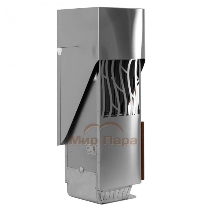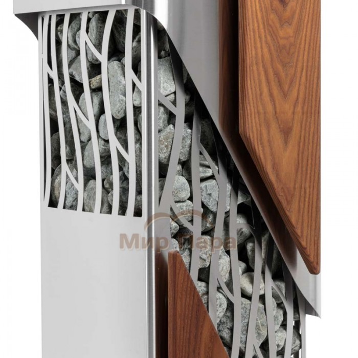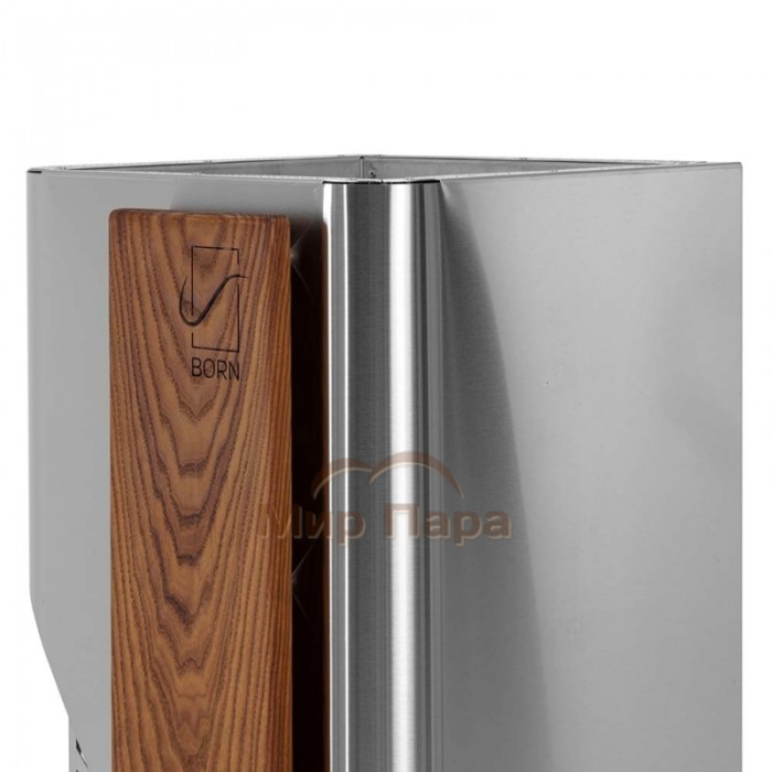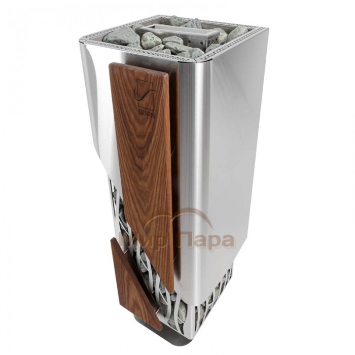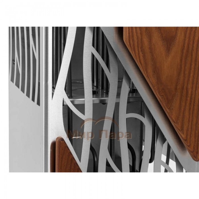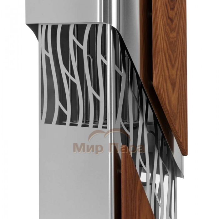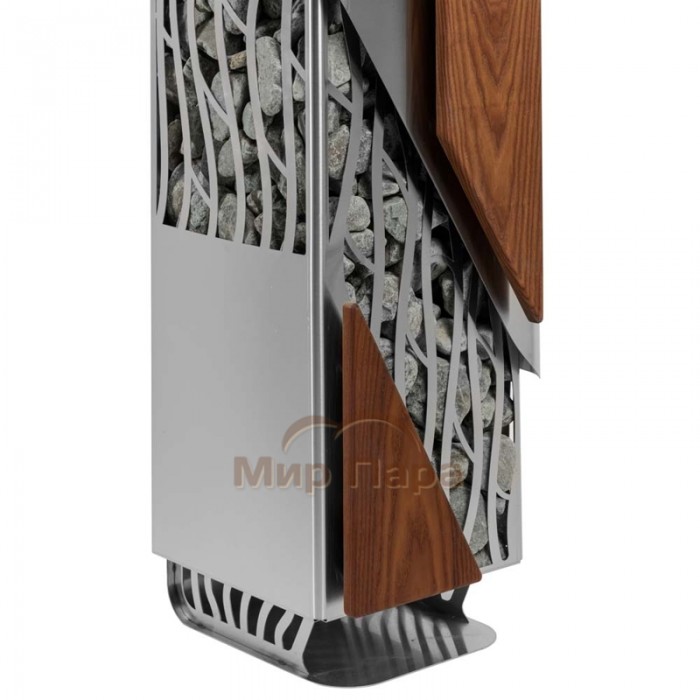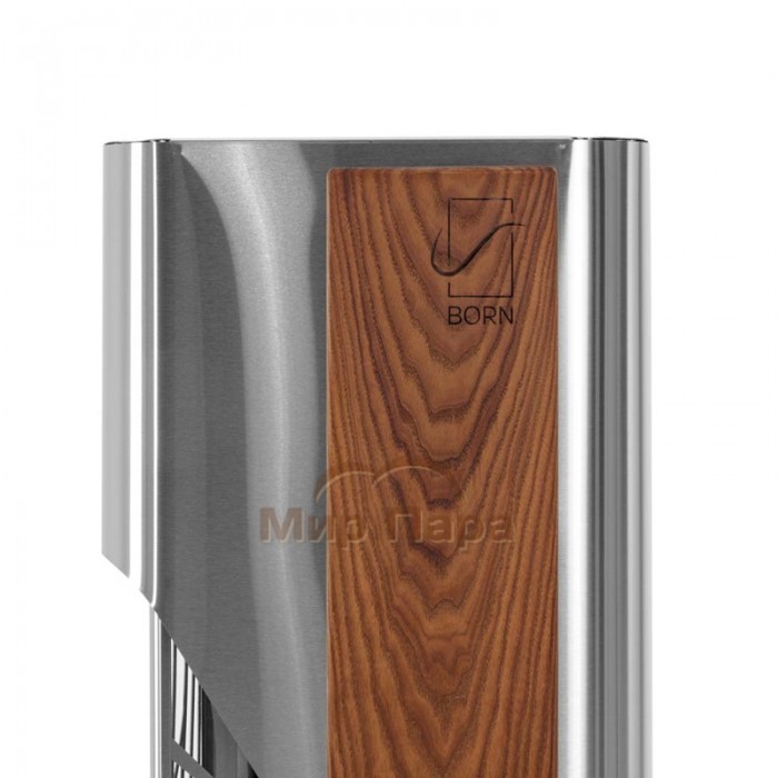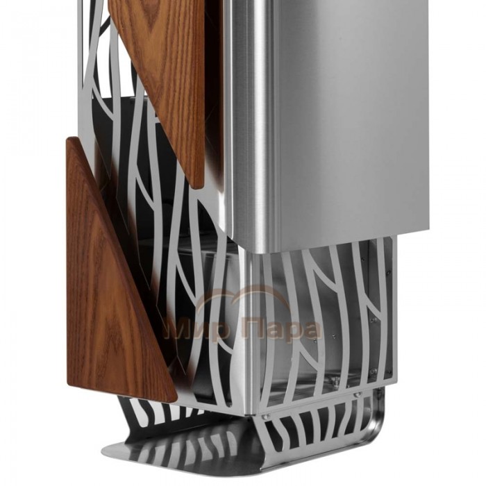 Дизайн каменки BORN AIR. Изящный орнамент на корпусе гармонично сочетается с элементами из термоясеня. Вертикальная конструкция печи с улучшенными аэродинамическими свойствами позволяет прогонять большую массу воздуха. Благодаря активной циркуляции, искусственно-создаваемой самой каменкой, парная за считанные минуты наполняется теплом.