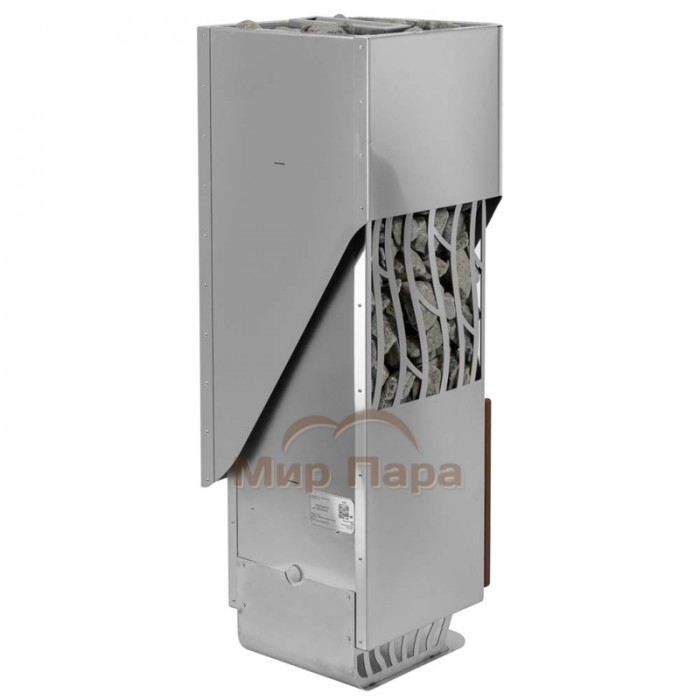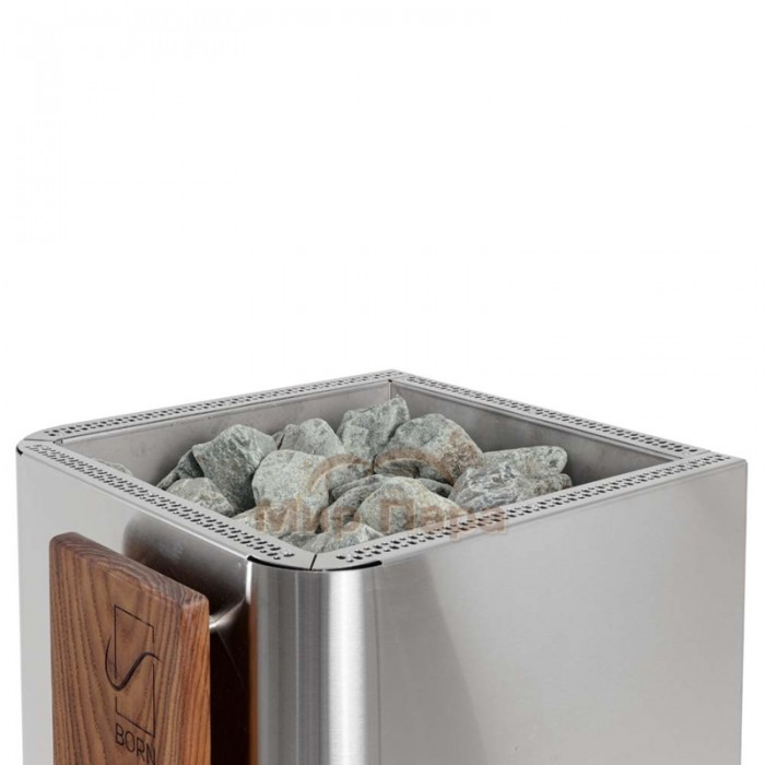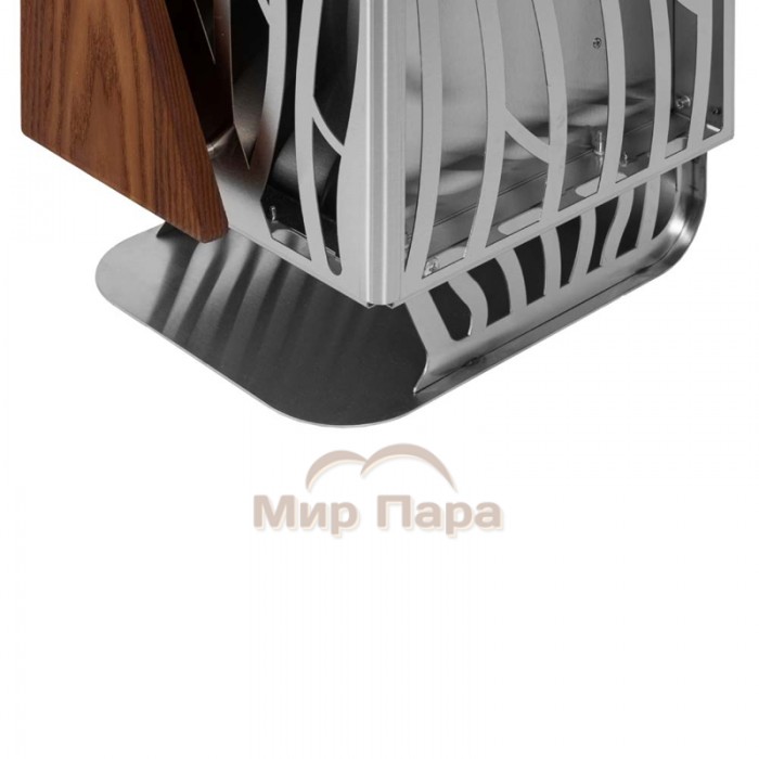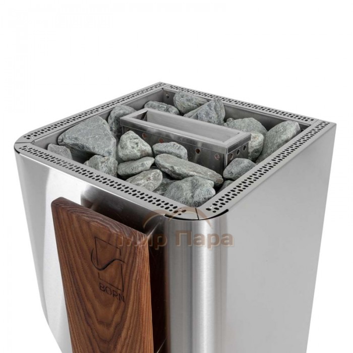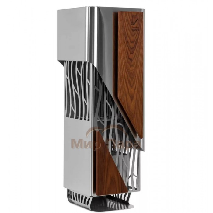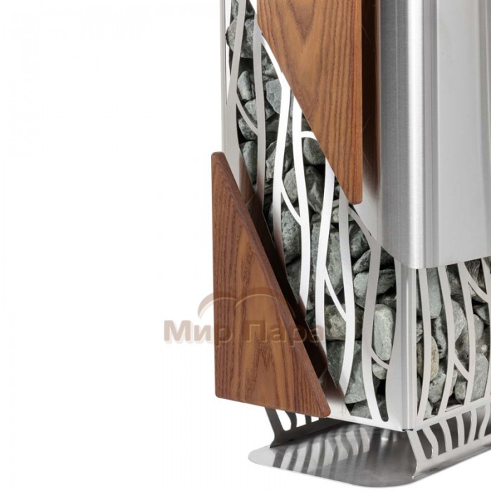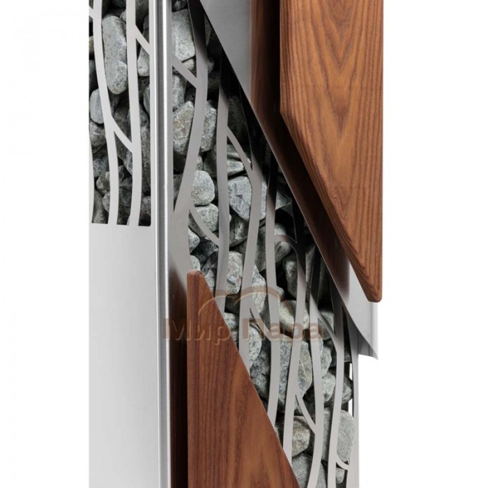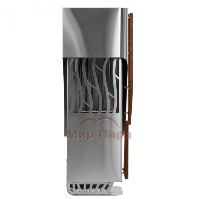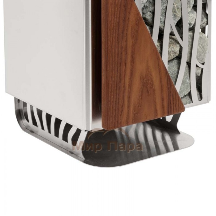 Дизайн каменки BORN AIR. Изящный орнамент на корпусе гармонично сочетается с элементами из термоясеня. Вертикальная конструкция печи с улучшенными аэродинамическими свойствами позволяет прогонять большую массу воздуха. Благодаря активной циркуляции, искусственно-создаваемой самой каменкой, парная за считанные минуты наполняется теплом.