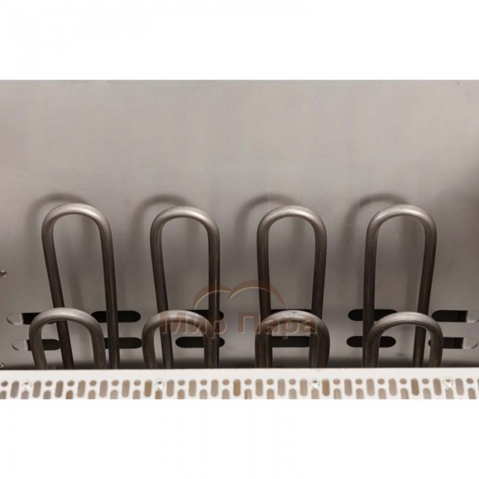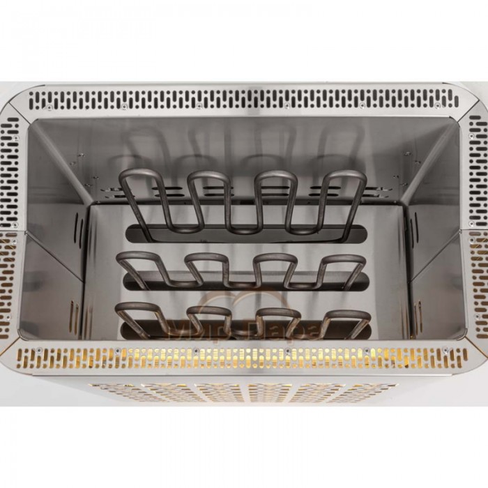 На передней части кожуха есть сетка со специальным паттерном, за ней находится встроенная подсветка, которая включается во время работы ТЭНов. Так создается реалистичная имитация тлеющих углей, как при использовании традиционной дровяной печи, что безусловно, добавляет парной особого уюта.Подсветка не только выполняет декоративную функцию, но и служит индикатором включения и выключения ТЭНов. Когда печь нагревает помещение до нужной температуры, подсветка автоматически выключается, что делает процесс использования каменки более интуитивным.