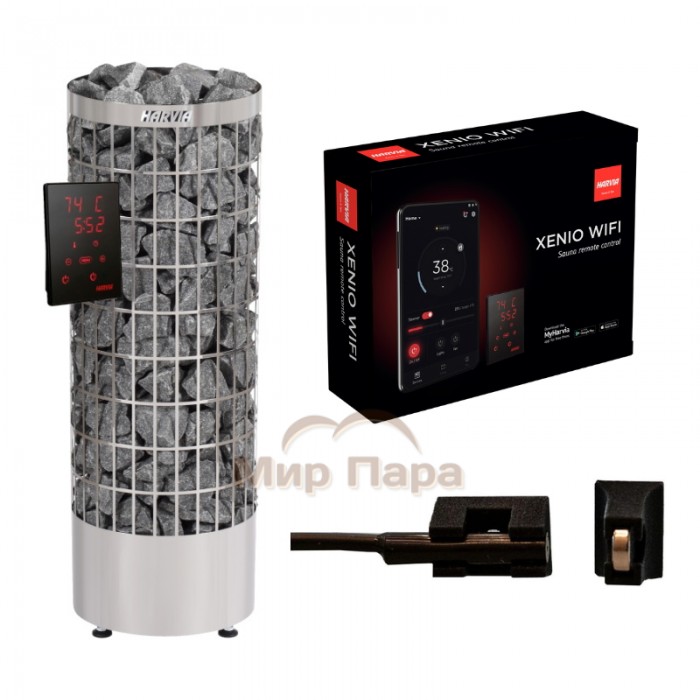 Чтобы Вы могли управлять сауной с Вашего смартфона, мы заменили входящую в комплект печи панель управления Harvia WX380 на панель управления Harvia Xenio WiFi и включили в набор дверной контакт.