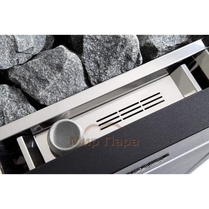 Virta Combi оборудована баком для воды на 5 литров, который наполняется автоматически из водопровода. Каменка оснащена также чашей из мыльного камня для жидких ароматизаторов и решеткой из нержавеющей стали для ароматизаторов в пакетиках.