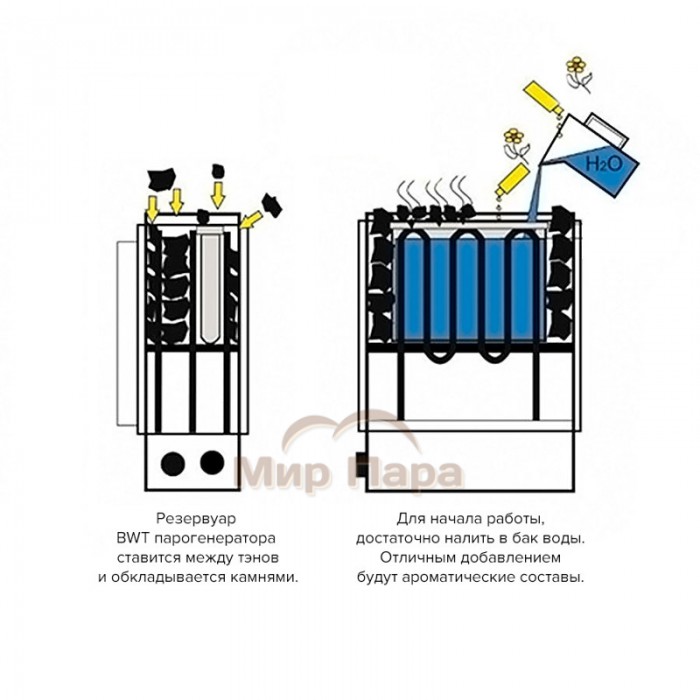 Модели Himalaya Pure/Elite имеют панель управления Pure или Elite. Кроме того, они оснащены парогенератором WT. В середине нагревательных резисторов находится резервуар для воды, который удерживает воду и работает как пассивный испаритель, который создает еще более влажный воздух в сауне. В резервуар можно добавить ароматические вещества для усиления впечатлений.
