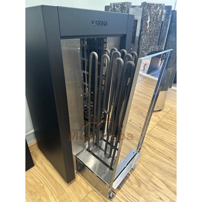 Печи Karina Clio просты в установке - все подключения выполняются через передний люк для обслуживания. Теперь если ТЭНЫ необходимо заменить, то это можно сделать быстро и легко, ведь весь блок ТЭНов можно вытащить из печи не вынимая камни.