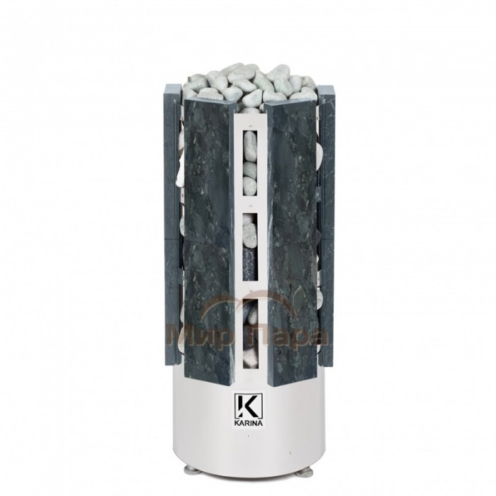 Электрокаменка Karina Forta 6 Онего Грин предназначена для использования в парных объемом до 8 м3. Печь выполнена в напольном варианте и обладает цилиндрической формой дополненной плитами из натурального камня Онего Грин. Напряжение питания - 220/380В. Данная модель имеет 3 тэна, расположенных в виде треугольника. В центре внизу расположен бак для воды емкостью 3 л, который является парогенератором. Выше парогенератора имеется емкость под мелкие камни или нержавеющие шары объемом 2,5 литра, вмещающая 5 кг мелкого камня, называемая закрытой каменкой с воронкой для подачи воды и получения мелкодисперсного пара.
