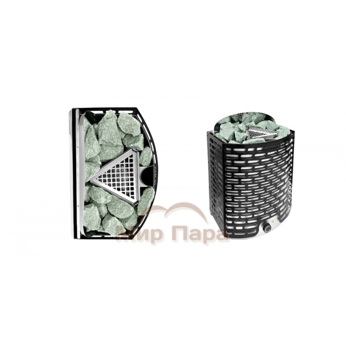 Нагревательный элемент в данной печи ТЭН диаметром 10 мм. При достижении показателя заданной температуры, электрокаменка полностью не отключается, а работает на постоянной основе в 50% от максимальной мощности, чтобы камни в печи всегда были горячие и давали пар. В отличии от любых аналогов (где печь отключается целиком, и камни становятся холодные). При понижении температуры в парной на 2-3 ℃ от заданной, вторые 50% мощности подключаются, и каменка начинает работать в полную мощность.