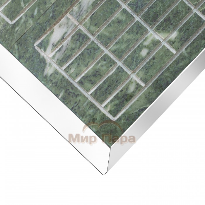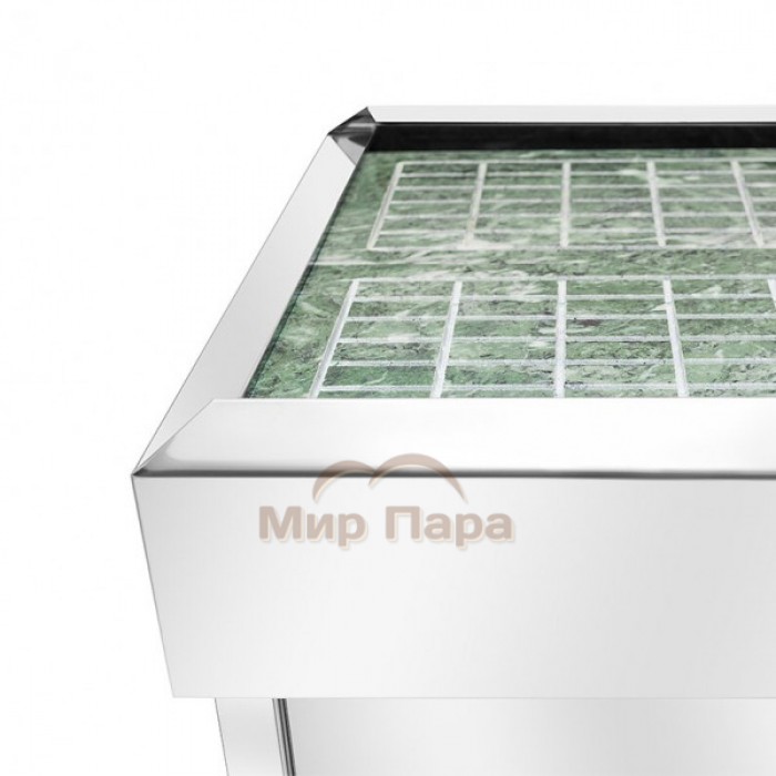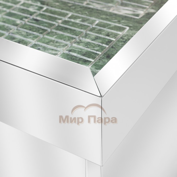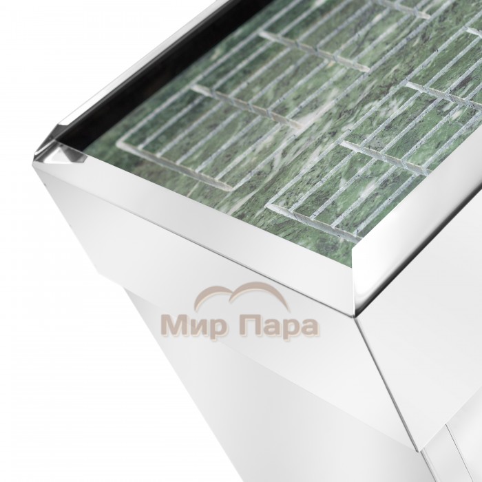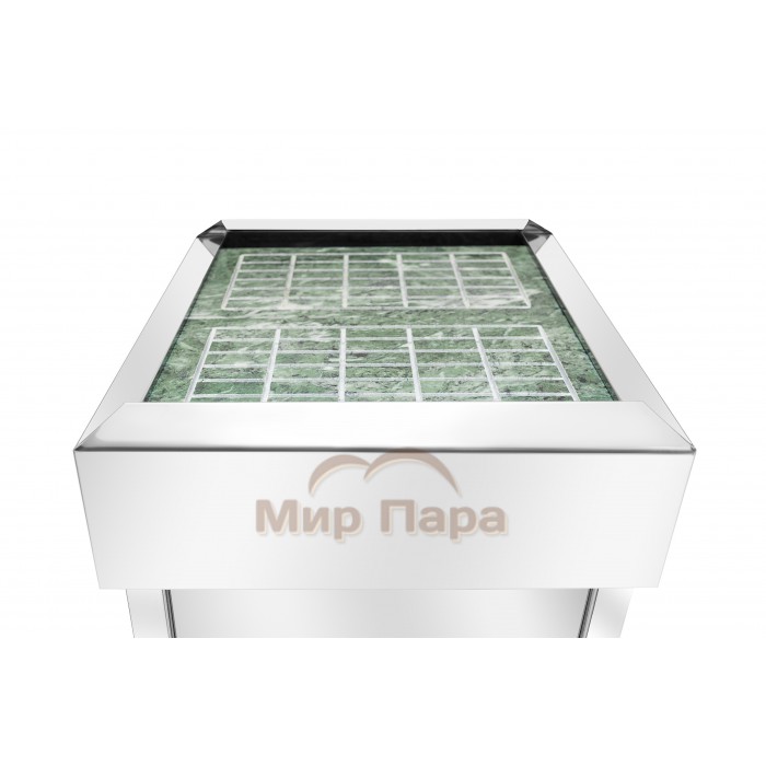 Электрокаменка оздоровительной серии в комплекте с двумя горизонтальными нагревательными плитами из природного камня Змеевика. Каждая плита высотой 6 см, массой 18 кг, с распилами специальной формы, и может использоваться в качестве испарителя. На такой плите вода испаряется постепенно и создает благоприятный и комфортный климат в бане.