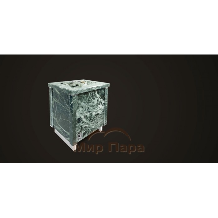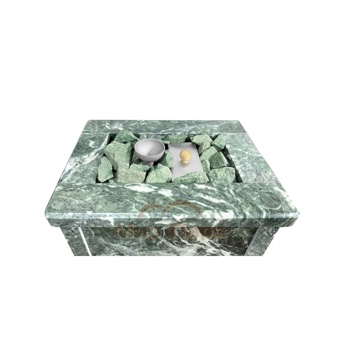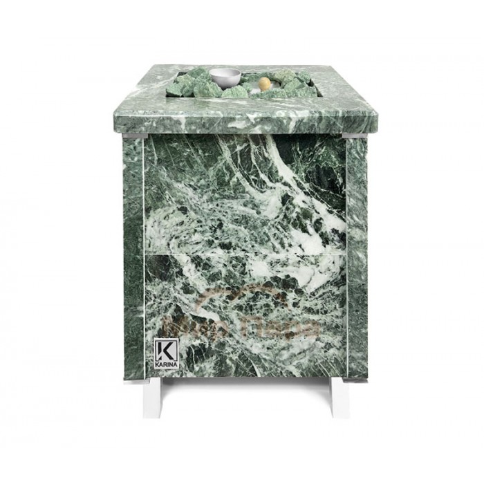 Электрическая каменка со всех сторон облицована натуральным змеевиком. Печь с подобным дизайном стильно смотрится в парильном помещении. Змеевик уже долгие годы используется для внутренней отделки бань. Его называют «аптекарским камнем» за его целебные качества. Минерал оказывает обеззараживающий эффект, положительно влияет на кости, оказывает успокаивающее воздействие и укрепляет иммунитет.
