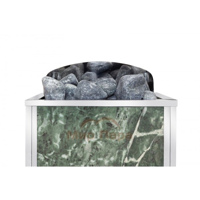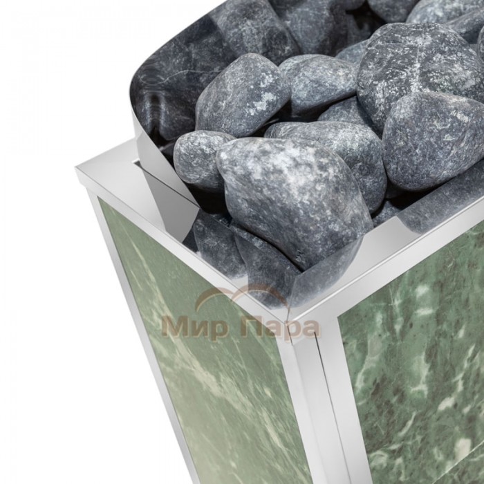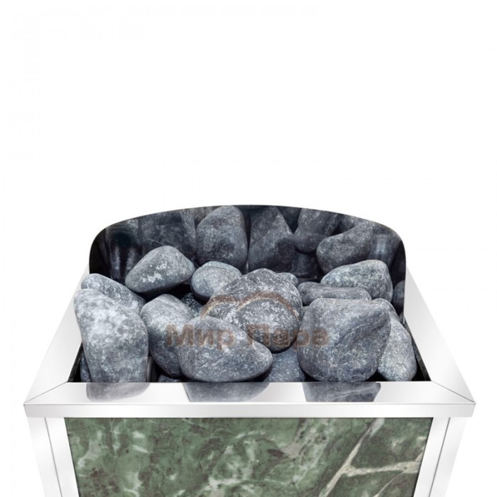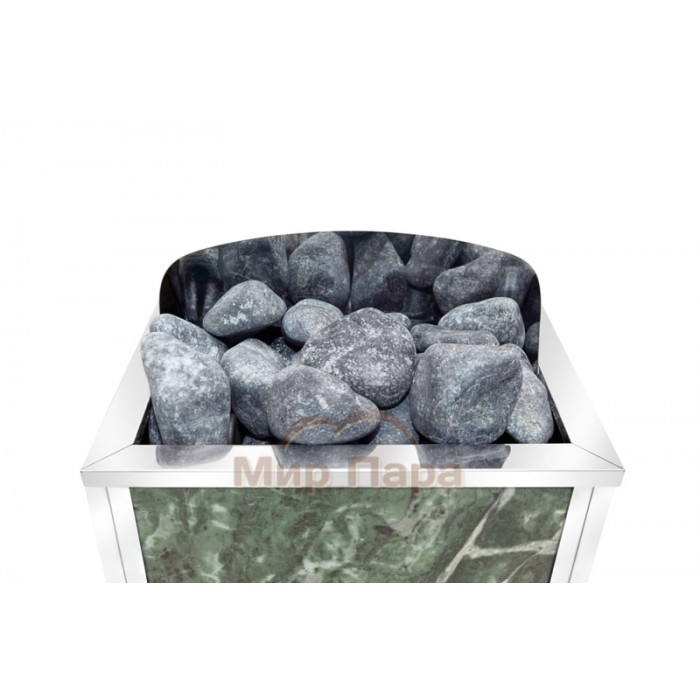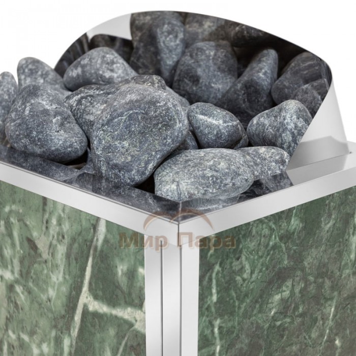 Облицовка из змеевика придает устройству стильный и современный вид. Печь с подобным дизайном стильно смотрится в парильном помещении. Змеевик уже долгие годы используется для внутренней отделки бань. Его называют «аптекарским камнем» за его целебные качества. Минерал оказывает обеззараживающий эффект, положительно влияет на кости, оказывает успокаивающее воздействие и укрепляет иммунитет.