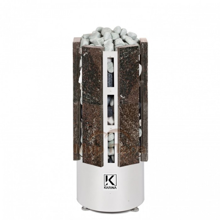 Электрокаменка Karina Forta 6 Амфиболит предназначена для использования в парных объемом до 8 м3. Печь выполнена в напольном варианте и обладает цилиндрической формой дополненной плитами из натурального камня Амфиболита. Напряжение питания - 220/380В. Данная модель имеет 3 ТЭНа, расположенных в виде треугольника. В центре внизу расположен бак для воды емкостью 3 литра, который является парогенератором. Выше парогенератора имеется емкость под мелкие камни или нержавеющие шары объемом 2,5 литра, вмещающая 5 кг мелкого камня, называемая закрытой каменкой с воронкой для подачи воды и получения мелкодисперсного пара.