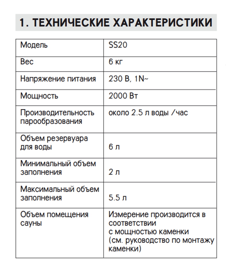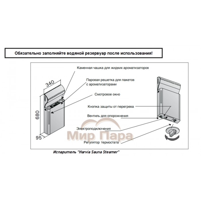Испаритель имеет термостат, измеряющий температуру в сауне. При необходимости, если температура в парилке превышает заданную величину, термостат выключает испаритель.