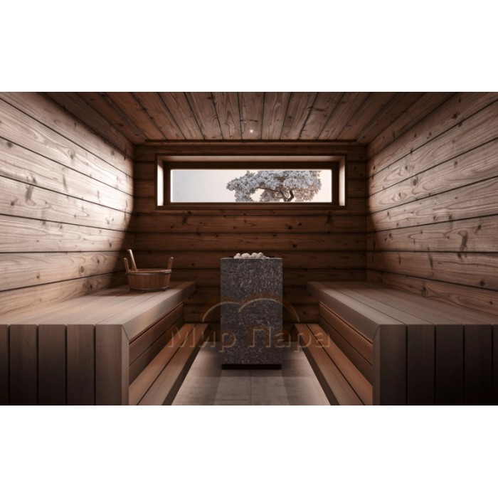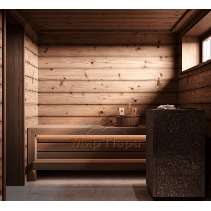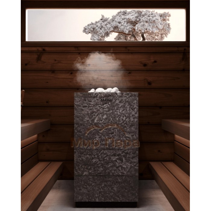 В печи 2 источника тепла: конвектор для нагрева воздуха и закрытая каменка с камнями для получения пара. Температура в закрытой каменке 550 градусов. Вы поддаёте воду, а температура всегда стабильна, всегда готовый пар в одном режиме. Управление печью с помощью пульта по каналу Bluetooth и мобильного приложения.