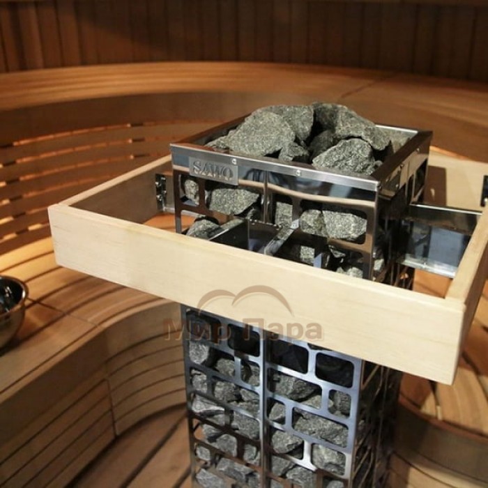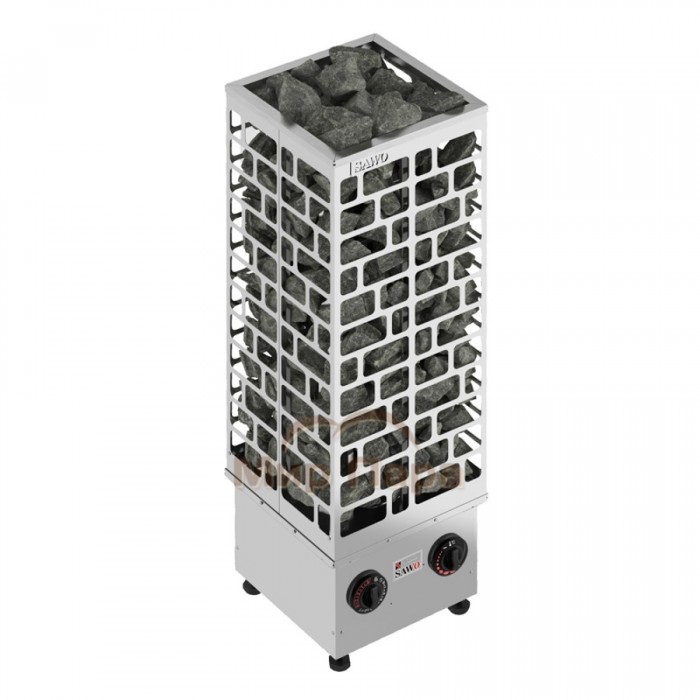 Sawo Cubos - линейка печей с необычным дизайном. Внешне электрокаменки напоминают каменную башню. Нагревательные ТЭНы находятся по центру. Снаружи каркас печи выполнен в виде сетки, которая заполняется большим количеством камней для сауны. Квадратное поперечное сечение печи делает ее универсальной для размещения в парной. Одну и ту же печь можно установить и в углу, и у стены и по центру парилку.