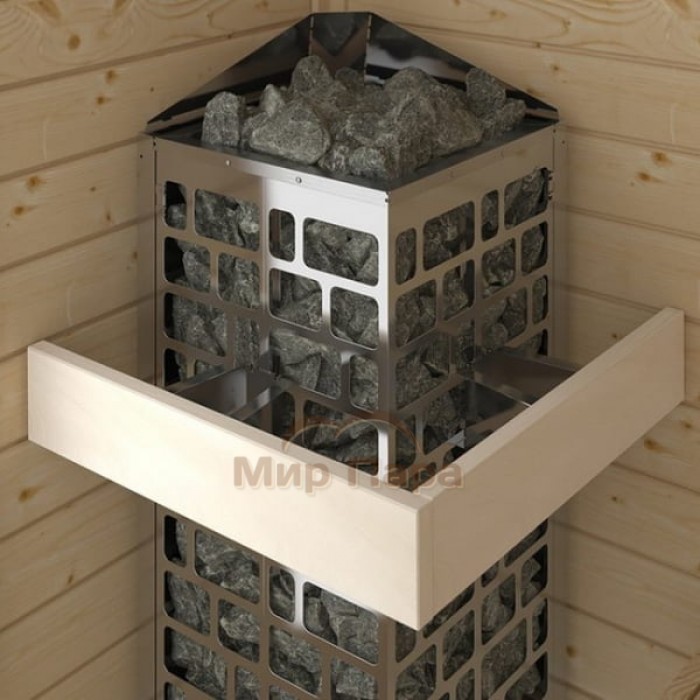 Корпус печи имеет нетипичную форму вертикального параллелипипеда с квадратным поперечным сечением. Нагревательные элементы находятся в центре электрокаменки и по краям обкладываются камнем. Готовая к эксплуатации печь напоминает каменную башню и позволяет поддавать воду во время парения не только сверху каменки, но и по всей поверхности корпуса.