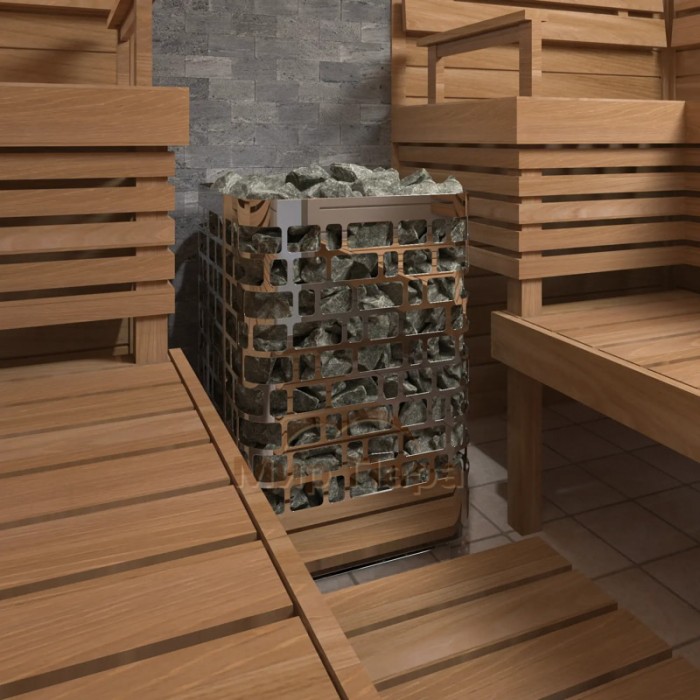 Мощность печи 15 кВт позволяет быстро прогревать помещения объемом примерно от 13 до 23 м3, обеспечивая стабильную температуру и комфортный микроклимат. Благодаря увеличенной емкости для камней (210 кг) печь долго удерживает тепло и дает мягкий, насыщенный пар даже после отключения нагрева.