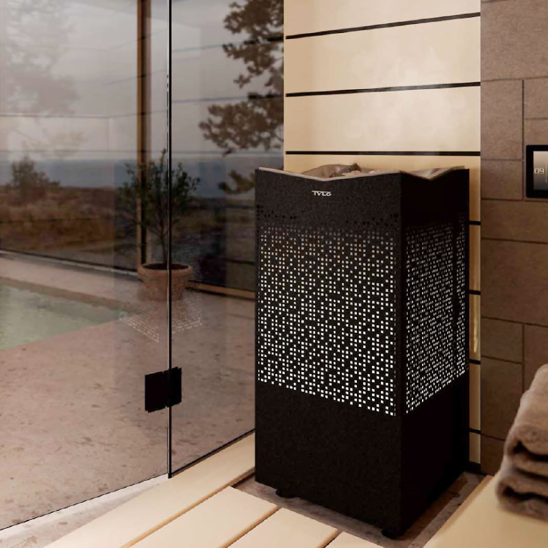 - Черный цвет корпуса подчеркивает современный дизайн и хорошо сочетается с древесиной и стеклом в интерьере сауны.