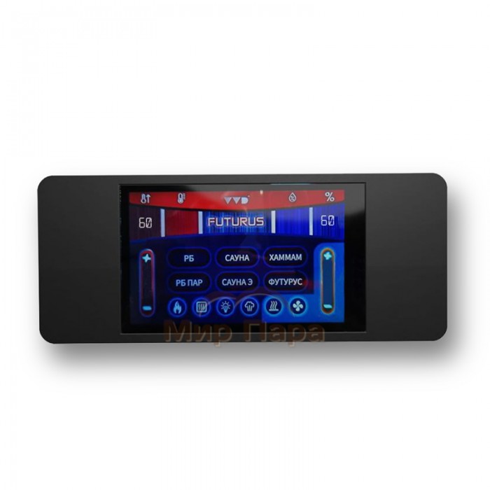 Интеллектуальный пульт управления печью имеет 5 заводских настроек: хаммам, паровая баня, баня, сауна, экстремальная сауна, а также индивидуальные настройки в режиме «ФутуРус». Пульт работает как независимая система управления, монтируется в смежное с парной помещение, возможно подключение удаленного доступа, в том числе синхронизация с голосовым помощником «Алиса» и внедрение в эко-систему «Умный дом» (дополнительная опция).
