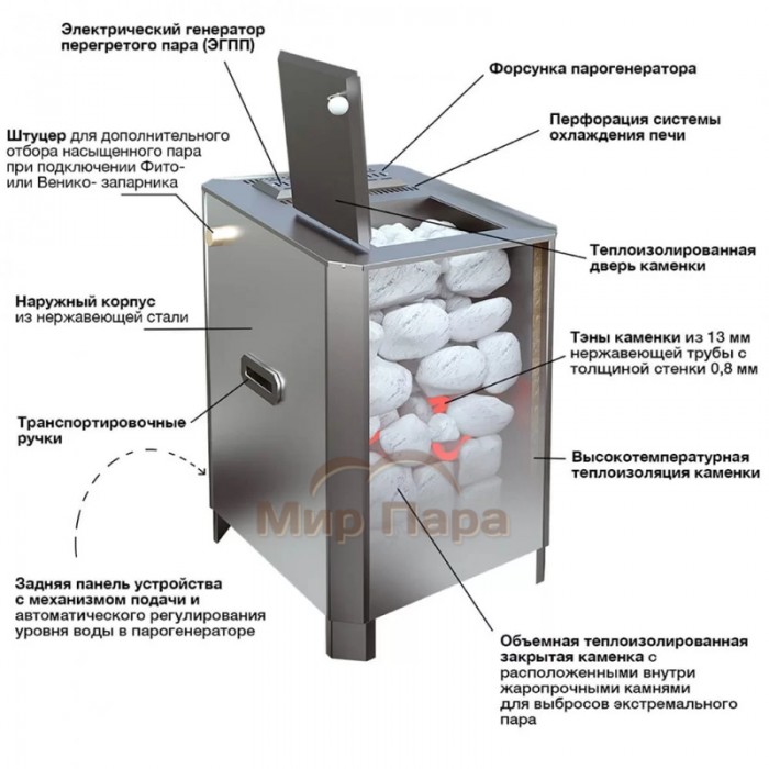 Паротермальные печи VVD ПАРиЖАР представляют собой современное электрическое оборудование с встроенным парогенератором перегретого пара, предназначенным для создания и точного поддержания комфортного температурно-влажностного режима в банном помещении. Конструктивно эти печи оснащены теплоизолированной закрывающейся каменкой с отдельным нагревом, которая работает автономно от парогенератора. Такая конструкция позволяет использовать три основных режима работы:- «Сухой нагрев» — нагрев воздуха осуществляется только ТЭНами каменки при открытой двери, без работы парогенератора;
