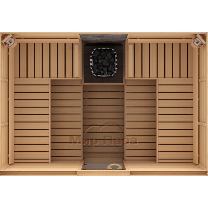 - Возможность регулировать расположение пологов и электрокаменки;