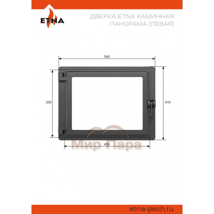 Каминная дверь Этна Панорама предназначена для установки в твердотопливные банные и отопительные печи, в закрытые камины. Дверь изготовлена из чугуна по ГОСТ 1412-85, конструкция двери – герметичная. Полотно двери выполнено в виде широкого прямоугольника, что в сочетании со значительной площадью остекления двери позволяет контролировать процесс горения. Панорамное стекло очень удобно для любителей полюбоваться на игру живого огня.