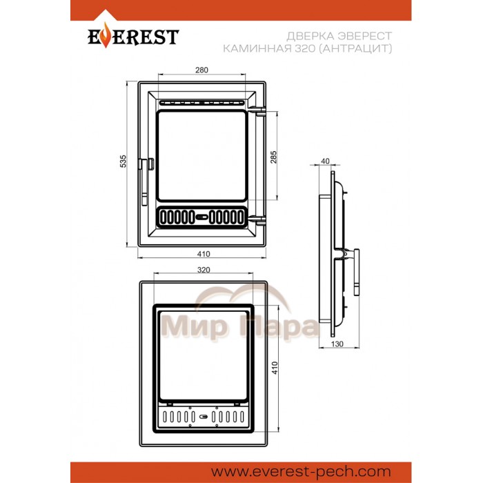 Дверка Эверест каминная 320 (антрацит) выполнена из жаростойкого чугуна ГОСТ 1412-85. Данная дверца имеет регулируемые заслонки, которые позволят стеклу не коптиться и оставаться долгое время чистым.