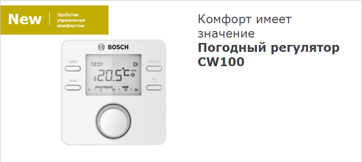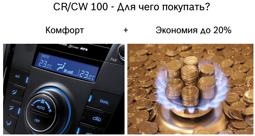 Погодозависимое управление позволяет учитывать снижение или повышение температуры снаружи помещения, таким образом, исключая даже малейшие колебания температуры внутри помещения, а так же достигается значительная экономия топлива, поскольку снижается инерционность системы, и котлу не приходится выходить на полную мощность, сжигая большое количество газа или дизельного топлива. При этом контроллер CW100 обладает всеми функциями, которые имеются у CR100.