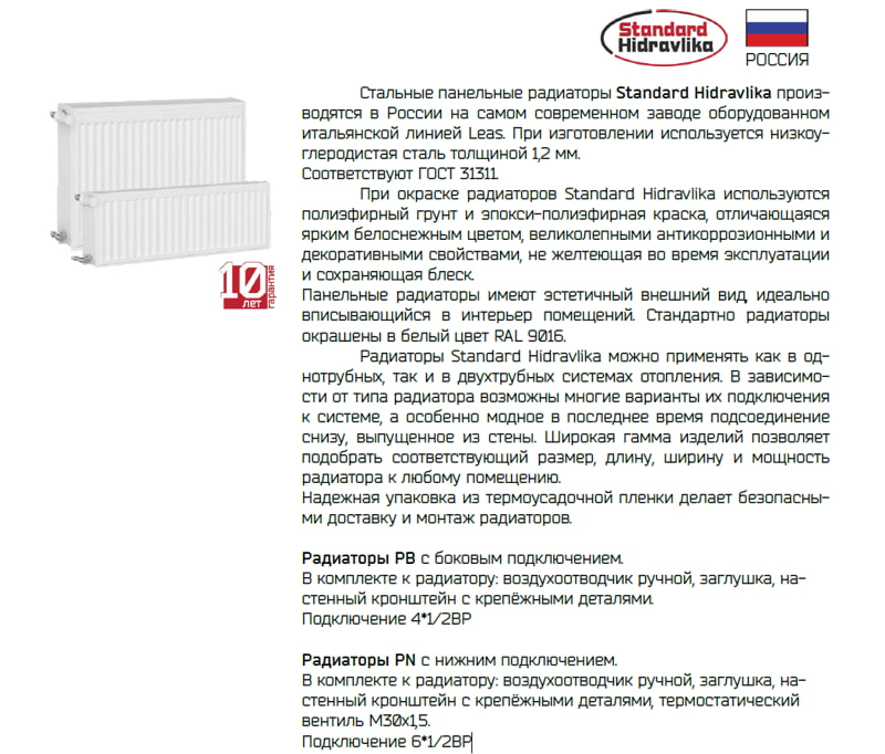 Стальные панельные радиаторы Standard Hidravlika производятся в Российской Федерации на современном заводе, оборудованном итальянской линией Leas. При изготовлении используется низкоуглеродистая сталь толщиной 1,15 мм. Соответствуют ГОСТ 31311.