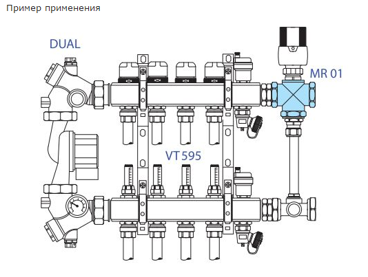 Клапан предназначен для использования в смесительных узлах гидравлических систем (байпасные узлы подмеса, узлы смешения для получения заданного уровня температуры смешанной жидкости и т.п.). Регулирование клапаном может осуществляться вручную или с помощью сервопривода.