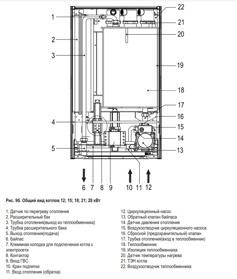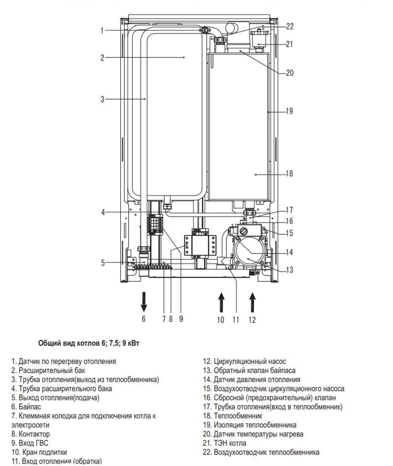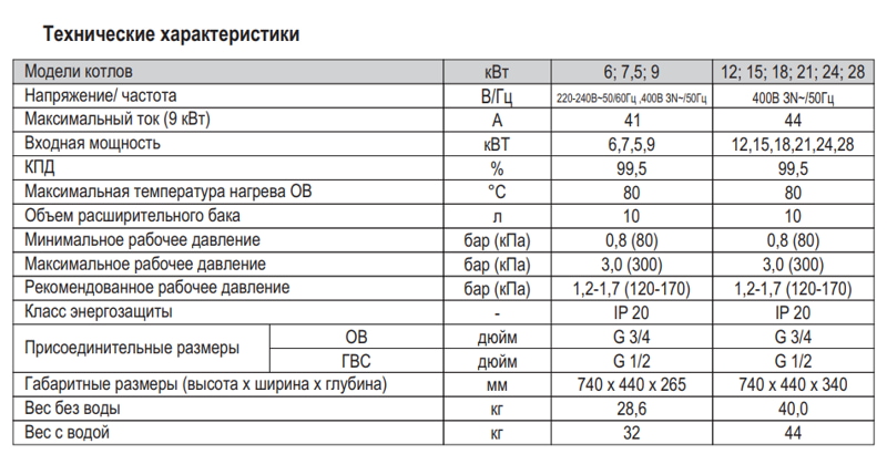 - возможность подключения бойлера косвенного нагрева подключение к однофазной сети 6-9 кВт;