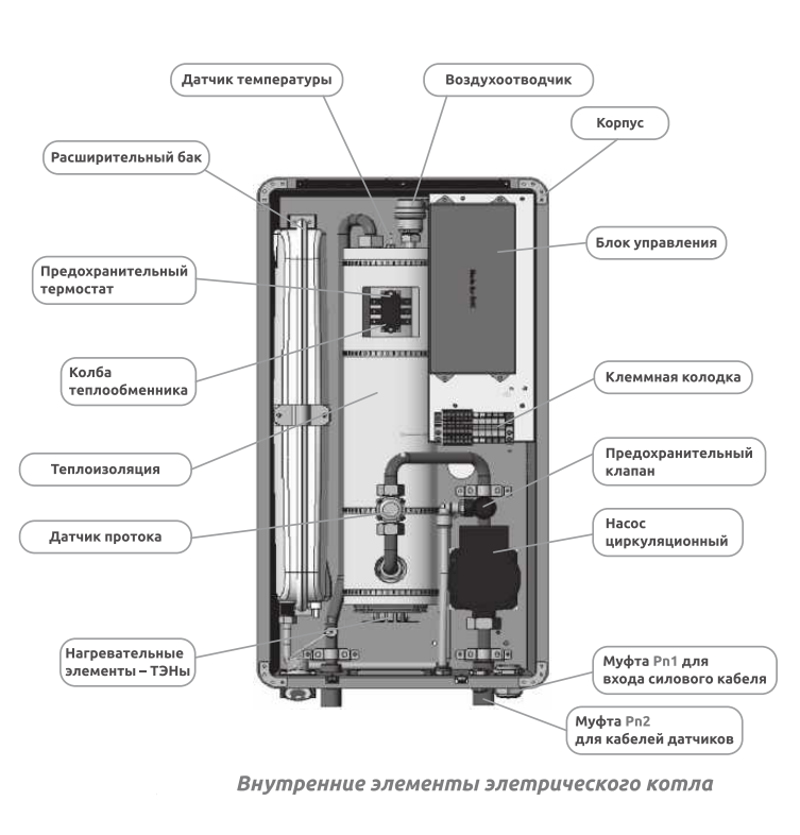 - Защита от перегрева - при перегреве теплоносителя в колбе теплообменника аварийный термостат отключает электропитание котла, и, соответственно, нагревательные элементы, независимо от наличия коммутирующего сигнала от блока управления.