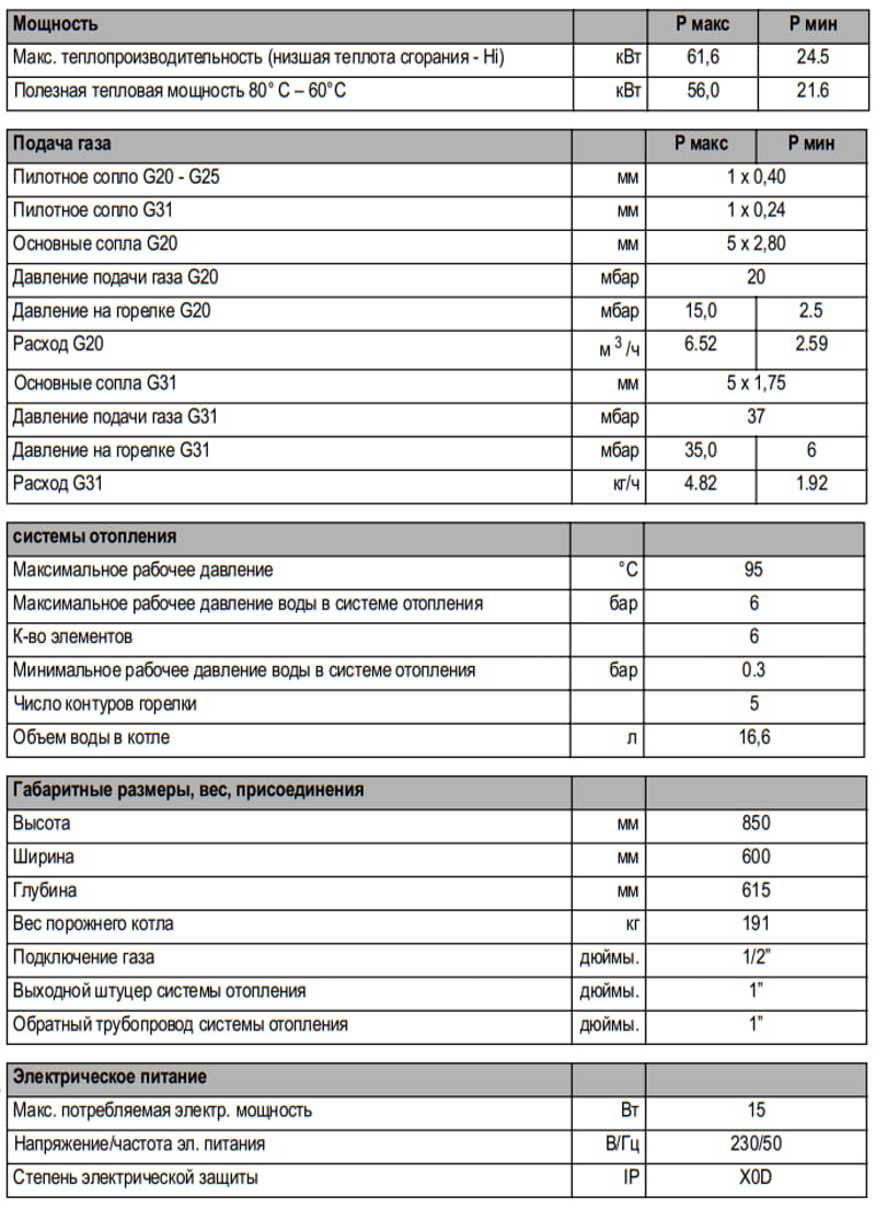Корпус котла включает в себя чугунные элементы, особая конструкция которых обеспечивает эффективный теплообмен в любых условиях эксплуатации, а также атмосферную горелку с электронным розжигом с ионизационной системой контроля пламени.