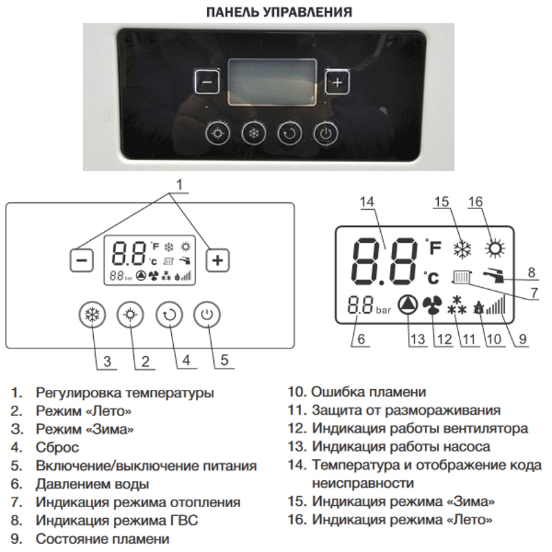 Котел оснащен функциями обеспечения безопасности и самодиагностики с выводом кода неисправности на дисплей, что позволяет быстро выявить причину и устранить её.
