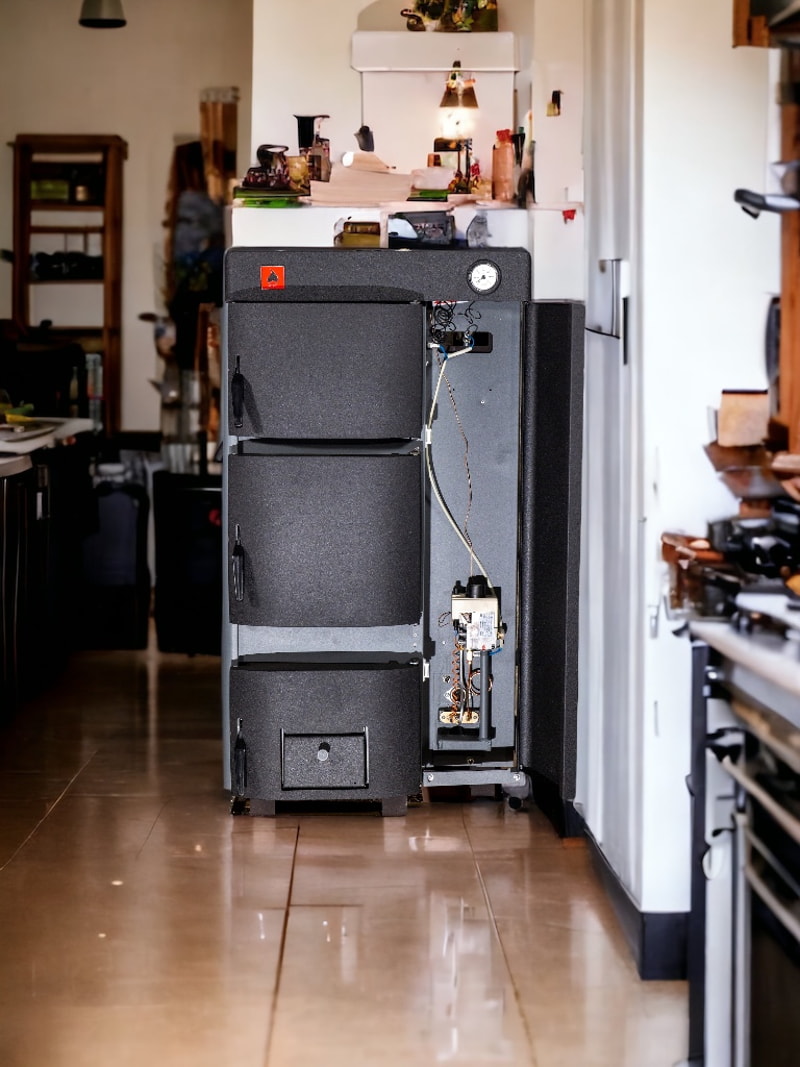 внимание обязательно уделяют способу хранения топлива: пеллеты, дрова или уголь должны находиться в специально предназначенном для этих целей ящике, который располагается на расстоянии не меньше метра от топки;