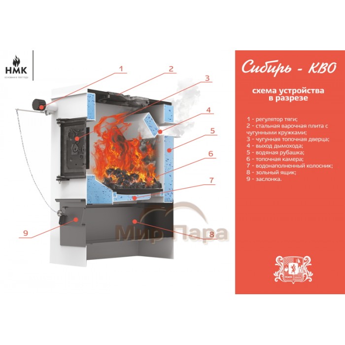 Твердотопливный котел Сибирь КВО 10 кВт - это пионер в линейке котлов с варочной поверхностью, в котором предусмотрена возможность установки автоматического регулятора тяги подачи воздуха. Данный котел функционирует на твердом топливе: дрова, прессованные брикеты, уголь и способен отапливать загородные дома площадью до 100 м2, оборудованных системами водяного отопления с естественной или принудительной циркуляцией.