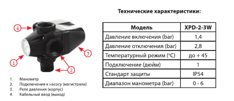 Реле давления XPD-2-3W представляет собой 2-х контактное реле замыкания и размыкания электрических цепей, срабатывающее по давлению воды. После монтажа устройства в систему необходимо произвести настройку реле по давлению или оставить заводские настройки. Настроенное реле давления работает в автоматическом режиме.