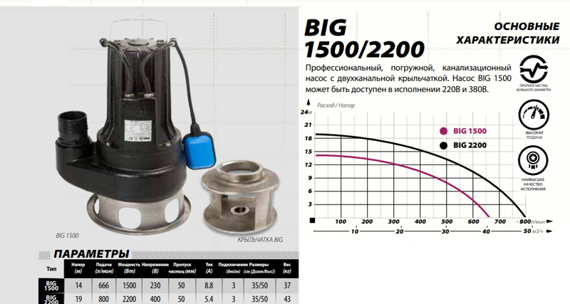 Конструкция крыльчатки выполнена таким образом, чтобы максимально ограничить возможность заклинивания насоса и позволяет перекачивать жидкость с включениями до 50 мм.