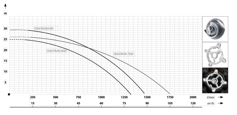 Корпус и крыльчатка насоса изготовлены из чугуна, что говорит о высокой прочности. Крыльчатка насоса MAXPUMP FEKATRON 7500 разработана для достижения большого напора и высокой производительности. В насосе установлен профессиональный измельчитель. Производительность насоса в максимальном значении 105 м³/час, а напор в максимальной точке 26 м. Насос работает на базе трехфазного двигателя мощностью 7500 Вт, 2900 об/мин, 380 В/50 Гц, IP 68.