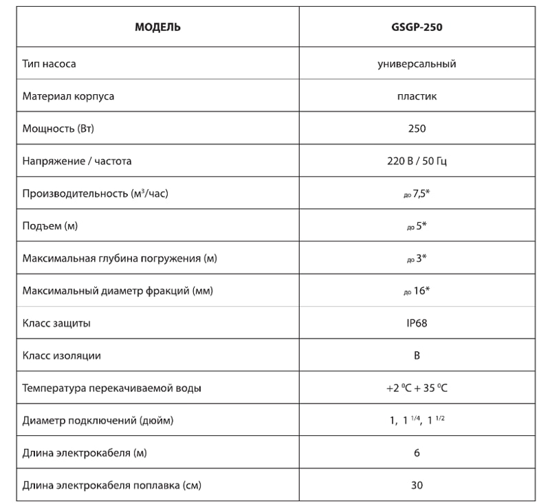 Технические характеристики дренажного насоса JEMIX GSGP-250 включают мощность 250 Вт, максимальную производительность до 7,5 м3/час, максимальный подъем до 5 метров, подключение шланг/труба 1, 1¼, 1½ дюйма, максимальную глубину погружения до 3 метров, напряжение 220 В, 50 Гц, длину сетевого кабеля 6 метров, максимальную температуру воды +40°С, объем упаковки 0,014 м3, вес 2,25 кг.