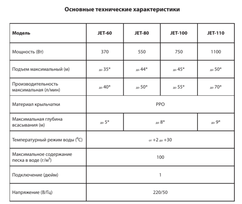 - Поверхностные насосы JEMIX серии JET предназначены для работы от электрической сети с напряжением в 220-230В и частотой 50Гц.