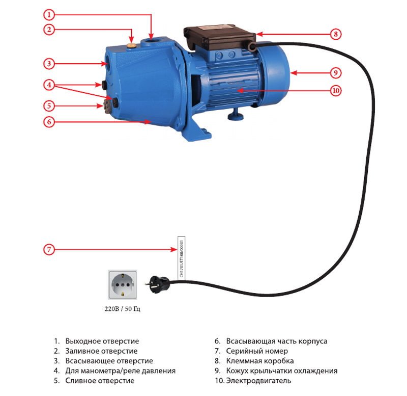 Поверхностный насос JEMIX серии JET состоит из всасывающей части корпуса внутри которой находится крыльчатка, заливного отверстия, сливного отверстия и однофазного асинхронного электродвигателя с крыльчаткой воздушного охлаждения.