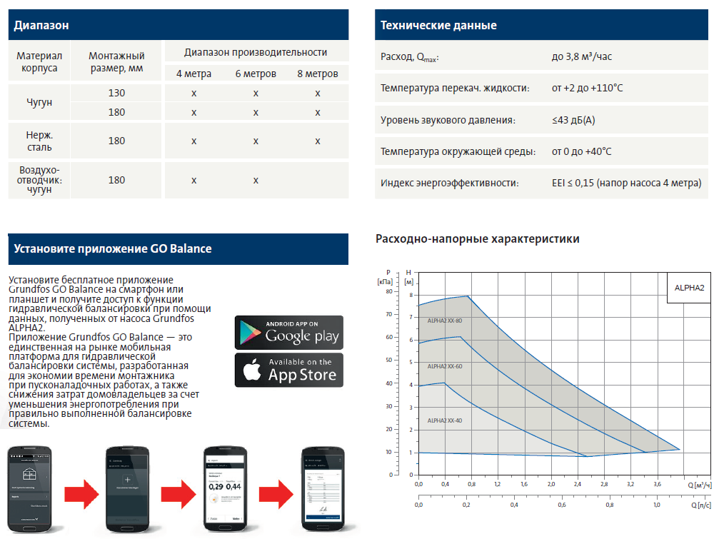 Помимо этого, новые ALPHA2 оснащены функцией балансировки системы отопления. Насос, взаимодействуя с пользователем через мобильное приложение Grundfos GO Balance, анализирует гидравлические характеристики системы отопления и выдаёт рекомендации по настройке запорно-регулирующих клапанов (необходим модуль связи ALPHA Reader).